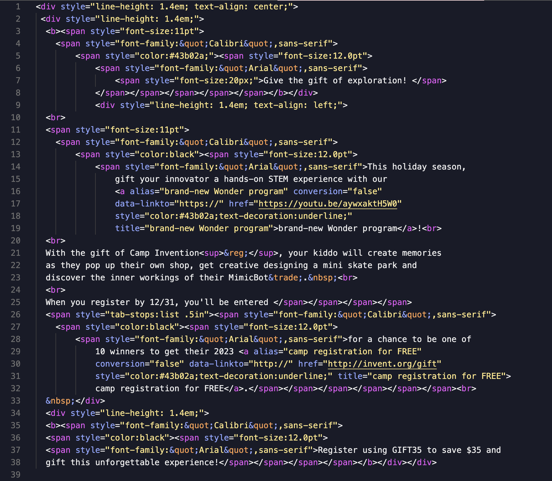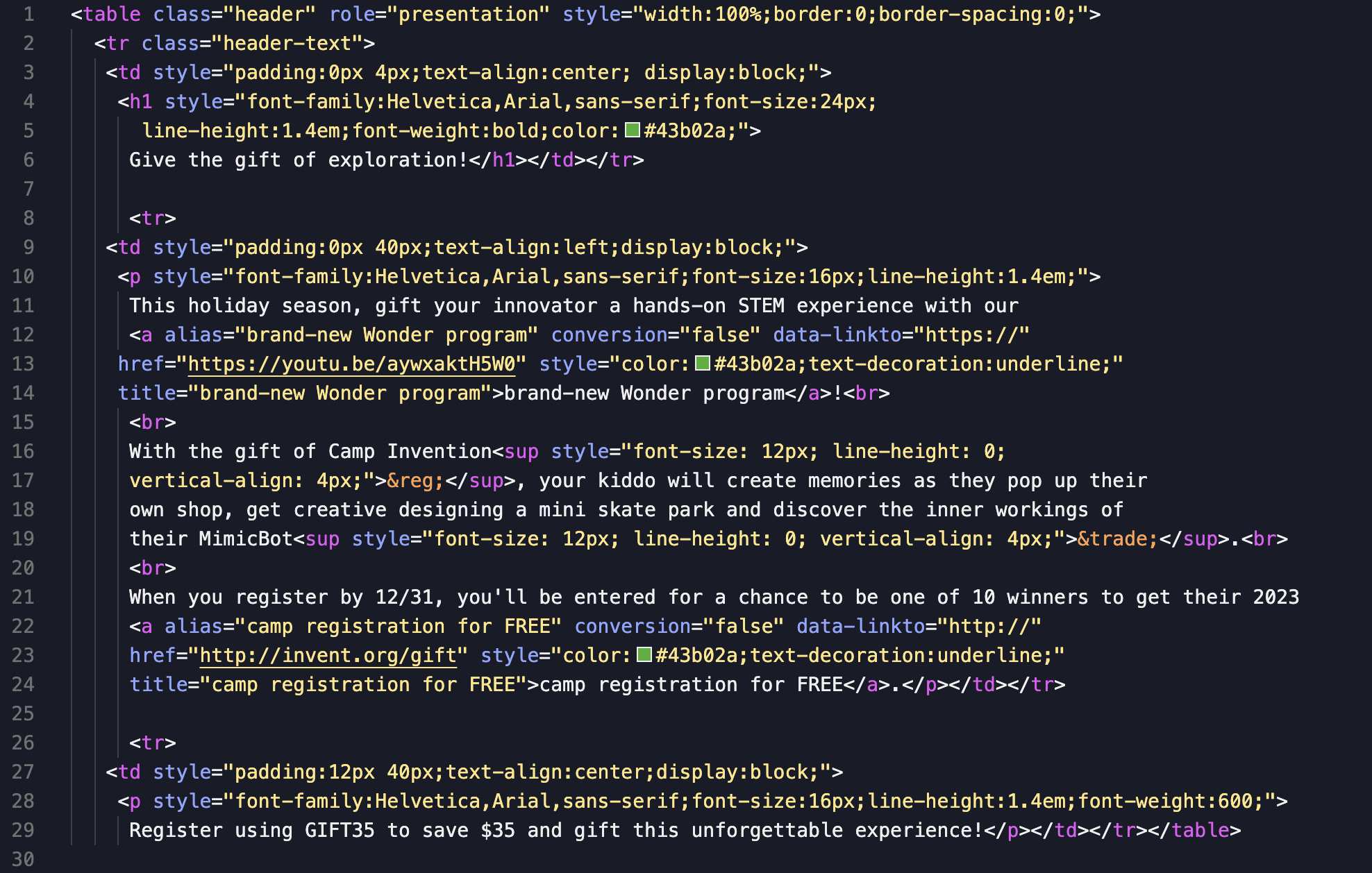 Upon discovering this issue, I spoke with leadership about taking on additional training so I could find a solution to the problem. Combining my experience designing assets for marketing e-mails and taking a course offered through Codecademy, I have successfully refactored all marketing e-mail templates to be compatible across all devices and platforms.